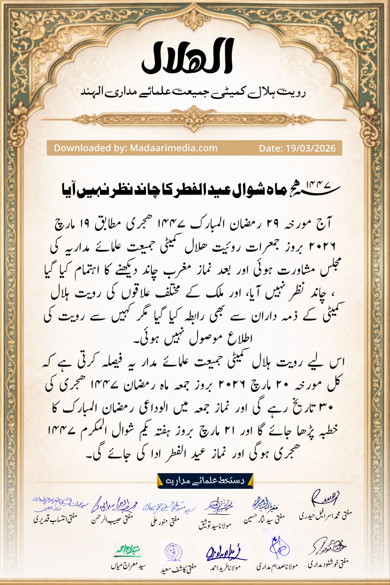 اس لیے رویت ہلال کمیٹی جمیعت علمائے مدار یہ خصوصا حضرت علامہ مفتی محمد اسرافیل حیدری مداری، مفتی سید نثار حسین مداری، مولانا محمد سید توثیق منصف جعفری، مولانا مفتی سید منور علی حسینی، مولانا مفتی حبیب الرحمن علوی منظری، مولانا مفتی سید محمد انتساب حسین قدیری اشرفی مداری، مولانا مفتی خوشنود خان مداری، مولانا صدام مداری، مولانا فرید احمد مداری، مفتی کاشف سعید مداری، سید معراج میاں صاحب قبلہ و کل جمیعت علمائے مداریہ فیصلہ کرتی ہے کہ کل مورخہ ۲۰ مارچ ۲۰۲۶ بروز جمعہ ماه رمضان ۱۴۴۷ ھجری کی ۳۰ تاریخ رہے گی اور نماز جمعہ میں الوداعی رمضان المبارک کا خطبہ پڑھا جائے گا اور ۲۱ مارچ بروز ہفتہ یکم شوال المکرم ۱۴۴۷ ھجری ہوگی اور نماز عید الفطر ادا کی جائے گی۔